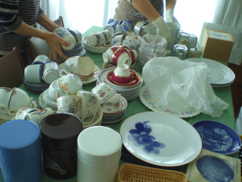 | 造作のキッチンを設置後、食器を収納し直している様子。 | 収納プランナーと施主のO様が一緒に、食器を収納いたします。 | 一度すべての食器を取り出して、要・不要を判断します。 |