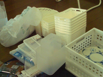 | 目隠し用のガラス板は布が入った温もりのある曇りガラスになっています。 | 収納の奥行きに合わせて収納用品を揃えました。 |