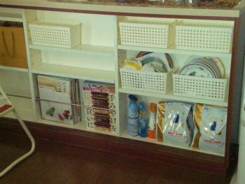 | リビング側の棚は使用頻度の高いものを収納します。 | 収納するモノに合わせて棚の奥行きを計算し、収納グッズを揃えました。 | 雑誌などどこに何が入っているのっかひと目でわかります。 |