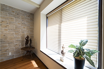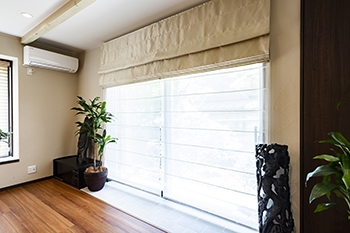 | リビングの窓には軽くて開けやすいロールカーテンを採用しました。閉めたままでも優しい光が差し込みます。 | サンルームをつくるかわりにリビングの窓を高くして自然光をたくさん採り入れられるようにしました。娘様がセレクトしたロールカーテンを採用しています。 |