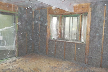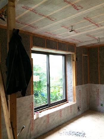 | 冬は室内でダウンコートを着て過ごされていたN様邸をスケルトンにし、床、壁、天井に断熱材を隙間なく吹き付けました。採用した断熱材は、セルロースファイバーです。気密性が高く、新聞紙を再利用してつくったものなので、環境にも身体も優しい断熱材です。断熱効果だけではなく、防音効果も期待できます。「家の中があたたかく、とても静かになりました」とN様からご感想をいただきました。 | 気密性の高いサッシに交換しました。窓台カウンターにもしっかりと断熱材を入れています。 |