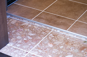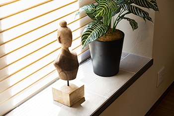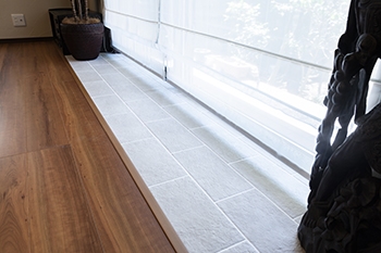 | 窓際の床はタイル張りにし、観葉植物や手工芸品を気兼ねなく置けるように工夫をしました。同時にお庭からの土埃がフローリングに入りにくい効果もあります。 | 窓台カウンターもタイル張りです。 |