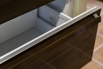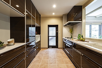 | キッチンにはタカラスタンダード「レミュー」を採用しました。ツヤのある落ち着いた色がN様邸によく似合っています。汚れてもサッと水拭きすればキレイになるので、お手入れの負担も軽減できます。 | 収納はN様と一緒にショールームで動作確認をしながら、一番使いやすい収納タイプと取っ手を選ばせていただきました。キッチン収納は、スライド式でバー取っ手をつけています。 |