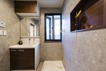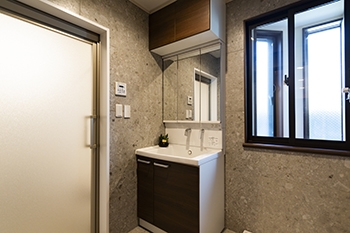 | 洗面台は、TOTOの「サクア」を採用しました。こちらもショールームで動作確認を行い、使いやすさを重視しました。水栓は引き出すとハンドシャワーとしても使えます。N様が引き出しやすく戻しやすい水栓を選ばせていただきました。 | N様のご希望で、洗面所に窓を取り付けました。今回、窓が設置できる配置に間取りを変更しています。 |