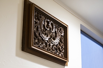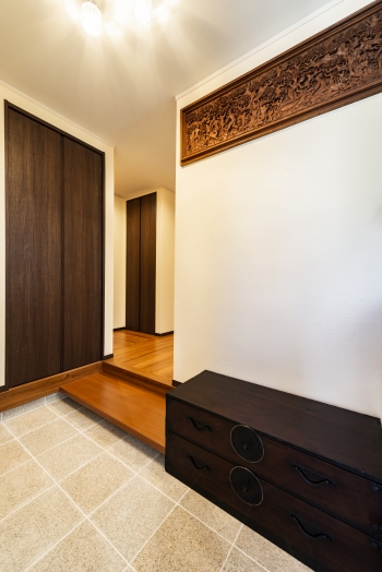 | 大きすぎて配置が難しかった家具は、家の中に飾れるようキタセツで解体し、パーツをオブジェに変身させました。 | 玄関は以前よりスペースを広く確保しました。ご主人様との思い出の家具がちょっとした腰掛けにもなります。荷物を置いたり、靴の脱ぎはきにも便利です。壁にかけたオブジェも素敵なアクセントになっています。 |