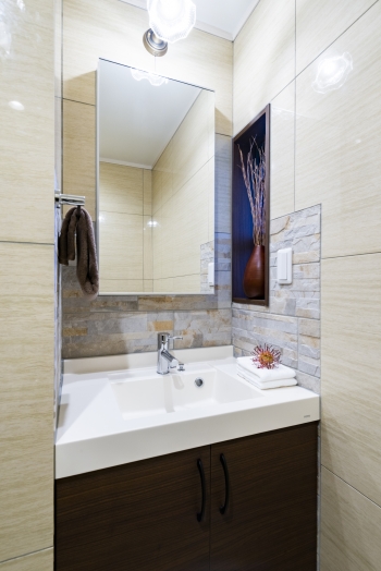 | トイレの洗面台にはTOTOの「マーブライトカウンター」を採用しました。キャビネットはキタセツで造作しています。ホテルライクな雰囲気で、素敵に仕上がりました。 |