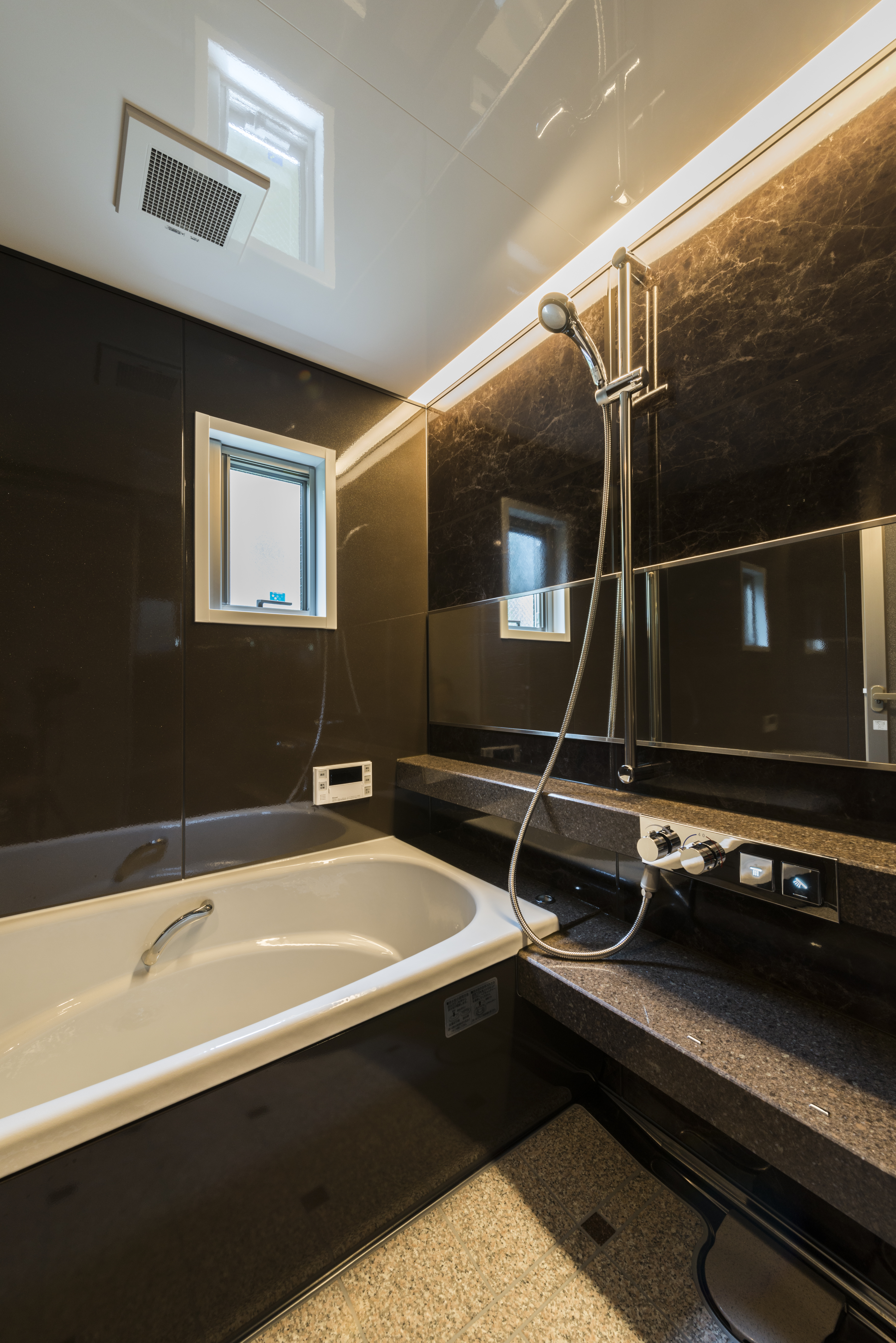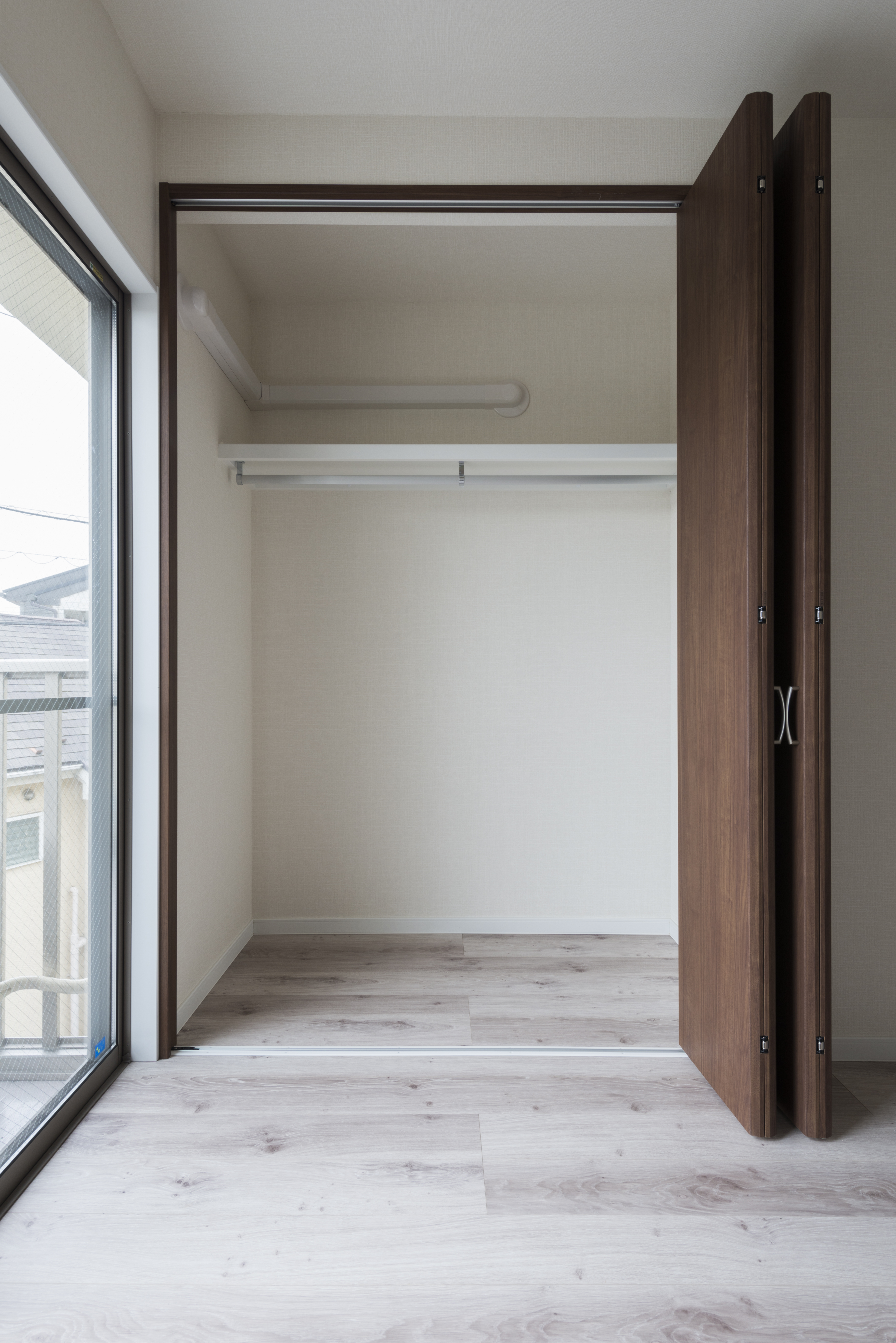 | 浴室には、優秀な保温性と美観が自慢のタカラスタンダード「伸びの美浴室」を採用。職人が手がけた鋳物ホーロー浴槽は、艶のあるしっとりとした肌感触が魅力です。 | 2階の洋室は、部屋と部屋の間にクローゼットをプラン。各部屋のプライベートを保ちます。エアコンの配管は化粧カバーでスッキリと目隠し。 |