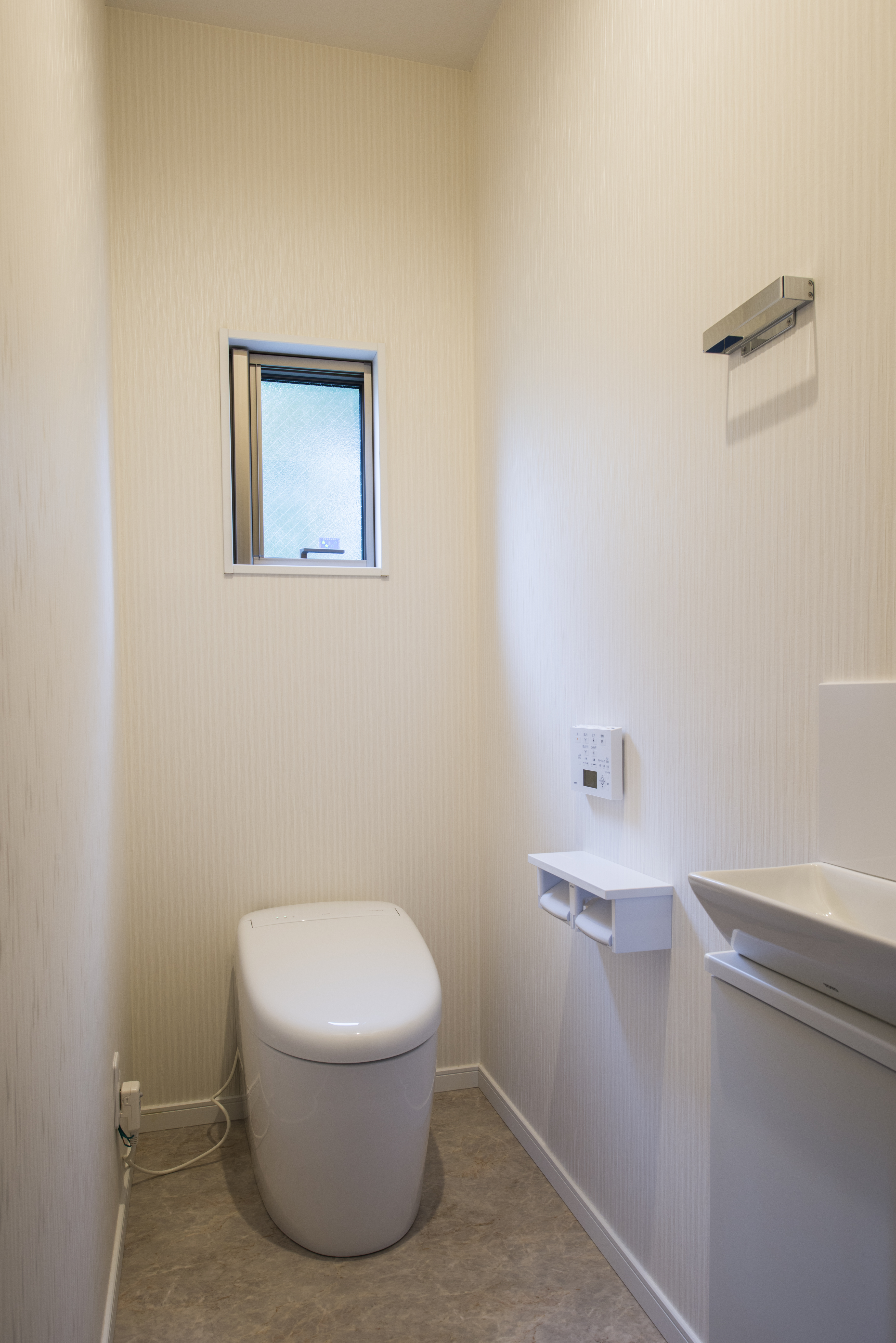 | 2階のトイレ。TOTOのタンクレスでスッキリと。艶のあるホワイトクロスで、清潔感のある空間に仕上がりました。 | 脱衣室にはワイドな洗面化粧台を設置。マグネット対応のホーローパネルやミラー下部のスライド収納が毎日の生活にとても便利です。洗濯機置き場も併設しました。 |