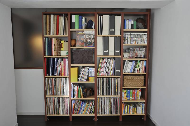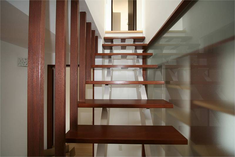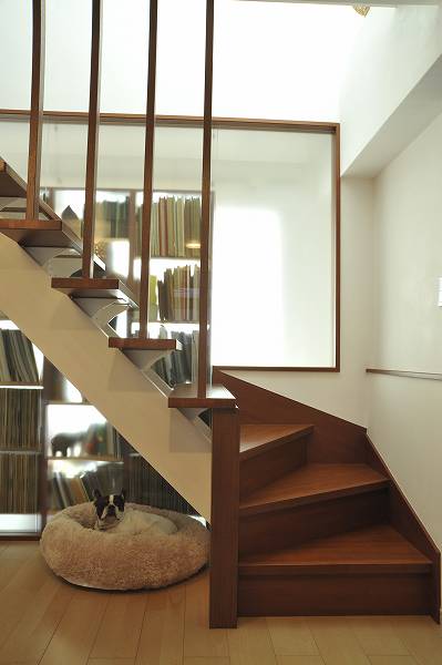| ゲストルームと階段の間仕切りには強化ガラスを取り付け、階段・玄関ホールへの採光を考えました。壁面シェルフを使用すれば収納の壁ができあがります | 野口作、オーダーメイドの収納シェルフ |
