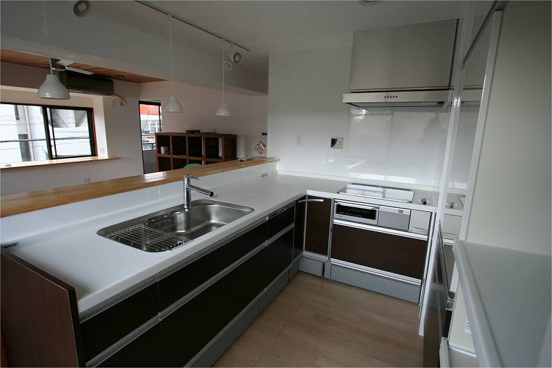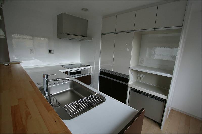 | 施工後の様子です。 | キッチンの後ろには収納たっぷりのキャビネットを配置 |