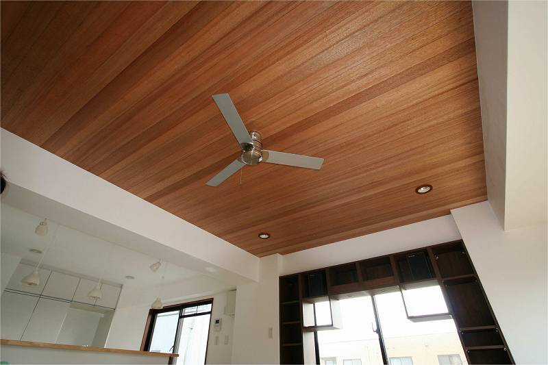 | 施工前は壁向きにI型キッチンでしたが、家族との会話がはずむ対面式のキッチンへ。白とダークオークのツートンカラーは高級感あるモダンな雰囲気に。 | 天井は素材感のあるラワンの無垢材を使用。シーリングファンとの相性もバッチリです。 |