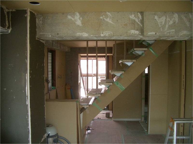 | アスファルトシートを貼り、浴室の防水工事です。 | 床下に床暖房のフィルムを敷き詰めている様子。寒い冬場はこれで足元あったか。 | 階段が完成。日の光が通って明るくなります。 |
