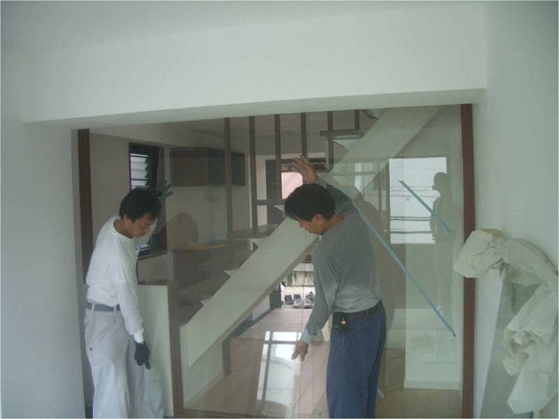 | 階段横の強化ガラスを取り付けている様子です。搬入の際は十分な注意をして作業しています。 |