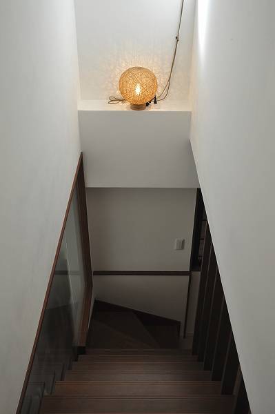| 玄関を入るとガラス越しに光が降り注ぐホール | 階段の梁部分には球形の照明を配置 |