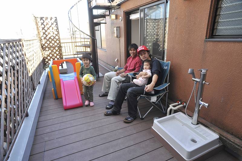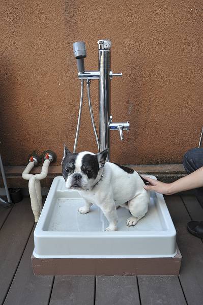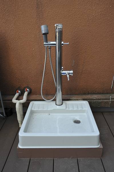 | ウッドデッキの水まわり。 | 温水シャワー付きでペットも洗えます。 |