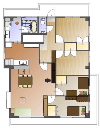 1 : お子様たちの成長に伴い、家族4人が揃うとリビングの窮屈さを感じるようになったので、広々としたリビングにリフォームしたい。 2 : 同じくお子様たちの成長に伴い、子供たち用に個室を作りたい。 3 : キッチンを通らなければトイレに行けないという不便な間取りを解消してほしい。 とのご要望です。 |