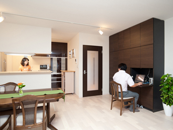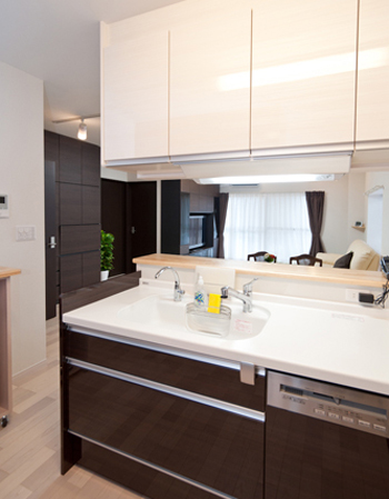| リビングに家族が集まり、それぞれが寛げるゆとりのある間取りに。問題だったトイレへの、動線も解決します。空間的には家族4人が使うのに充分な面積がありましたので、広々としたリビングのほか、各人の個室に至るまでN様の希望に沿うようレイアウトを考えました。 | キタセツのリフォームアドバイザーは、次々に発表される設備機器を把握し、その中からお客様の望むものを選んで紹介しています。田中は奥様と一緒にショールームを周り、実物を見ながら性能を説明したり、実際に使っているお客様から届くメリット・デメリットを伝えたりしました。奥様は悩んだもののキッチンはサンウェーブ社製の「サンヴァリエPitto」に決定。システムキッチンの上下の色を変え、下台をブラウンに吊戸棚をホワイトにしたことで厚感がありながらも明るいイメージに仕上がりました。このアイデアは田中のアドバイスから生まれたものなのだとか。対面式のキッチンにしたことで、家族との一体感を保ったまま家事に専念できます。目の離せない小さなお子様がいるご家庭でも喜ばれているレイアウトです。 |
