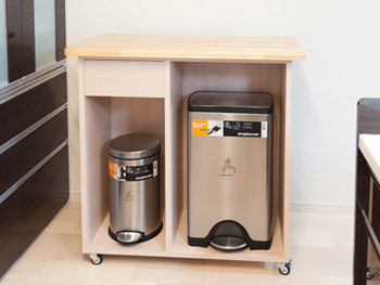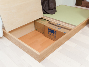 | 畳の下は深さ約30cmの大型収納です。N様邸では季節の物の収納場所として活躍しています。 | 工事担当の本間が作った「キャスター付ダストボックス」。ゴミ箱の大きさをに合わせて造作。 |
