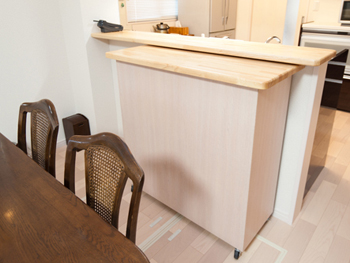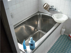 | 天板はカウンターの下にすっぽり収まることを想定。天板とキッチンカウンターの色、側板と床の色は合わせてあります。 | 在来工法のタイル貼りの浴室から、ユニットバスに取り替えました。TOTOの戸建て向けバスルームのRZシリーズのものです。 |