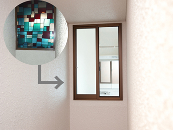 | 約3畳もの広々とした脱衣・洗面所。採光・通風が良く、明るく清潔な空間に。お掃除ロボット「ルンバ」の充電場所もここに確保しました。ちなみに、天井に見えるのは雨天時でも洗濯物が干せるように「ホスクリーン」という着脱可能な物干し竿が掛かっています。 | 脱衣・洗面所に採風のできるサッシを入れて空気の流れを改善しました。以前はステンドグラス調の開くことのできない窓でした。 |