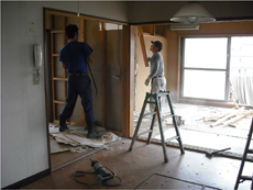 | 壁を取り壊して、躯体だけの「スケルトン状態」にすることから工事スタート!実際に工事が始まると、家具や家電の配置に左右されるコンセントや照明の位置をはじめ、機種によって異なる洗濯機の排水口など、図面上だけではわからない細かな確認事項が発生します。 | 工事スタッフの本間は、工事現場に足を運んで下さった奥様に工事の進捗状況と確認箇所を説明しては、家具のレイアウトなどをヒアリングし、電気系統の収まりを考えて丁寧に施工しました。広かった寝室の中心部に壁を取り付け2部屋に改修しました。 | なかでも、「ご主人の部屋のテレビを壁掛けタイプにしたい」という会話からは、テレビの重量をきちんと受け止められる強度を持った下地を入れて対応。通常なら見過ごしてしまいがちな情報も、お客様の立場に立ち、将来のことを見据えながら施工してあります。コンセントや照明の配線、または補強下地などを行い、天井をふさぎます。 |