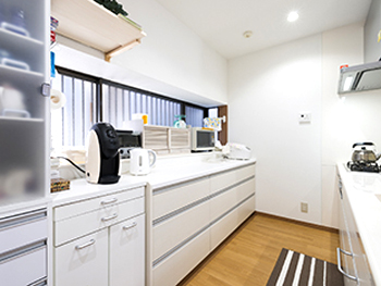 | 開放的なLDKは、18.8畳! ご夫婦がのびやかに過ごせる明るい空間が広がります。 | キッチンはTOTOのクラッソを選びました。カラーは、お部屋に馴染むオフホワトです。キッチン向かいにはカウンターを取り付けて、食事の支度がさっとすませられるようにしました。 |