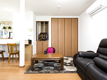 | 人が通れるスペースを確保し、できる限りリビングを広く配置できるように工夫しました。廊下があると空気の層ができるので、リビングへの暑さ・寒さの侵入が防げます。 | リビングの隣に寝室を配置しました。トイレも浴室も、寝室も1階にあるので、ワンフロアで生活できるようになりました。 |