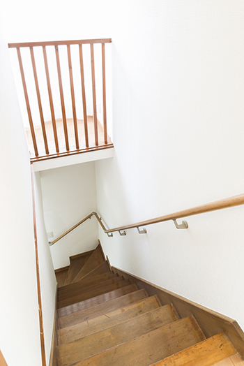 | S様邸では、住まいの床も壁も、ほとんど全てをリフォームで一新しましたが、唯一階段だけはそのまま。築68年の面影も大事に残すことにしました。味わいが感じられる階段です。 |
