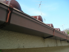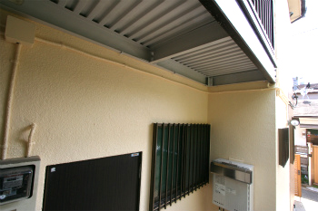 | 雨戸錆止め3)赤い塗料は「錆び止め」です | 雨戸錆止め4)上塗りをして完成! | 雨樋1)雨樋もリニューアルしました。雨樋の受け金物が錆ついています。 |
