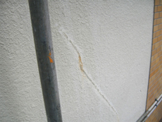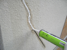 | クラック補修1)施工前で、もともと壁に入っていたクラック(ひび)です。 | クラック補修2)ひび割れた部分をあえて深くカットします。これは、割れた内側の面を平らにし、次の工程で行うコーキング材を奥まで入り込みやすくするためです。 | クラック補修3)コーキング材を注入して、外壁のヒビを埋めます。水が入り込まないよう、しっかりと作業します。 |