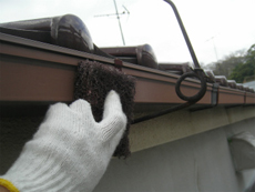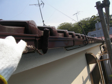 | 雨樋2)雨どいも、雨戸と同じく「ケレン」をして下地を整えます | 雨樋3)雨どい受け金具に錆び止めを塗った様子 | 雨樋4)上塗りをして完成! |