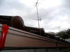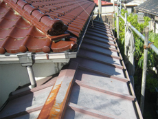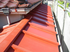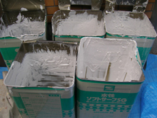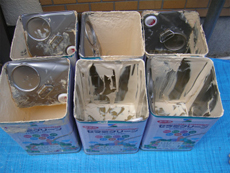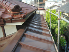 | 下塗りに使った塗料です。5缶使いました。 | 仕上げ用に使った塗料です。 | 屋根は瓦の部分はきれいでしたが、棒瓦が傷んでいました。 |
