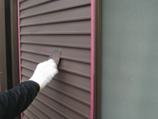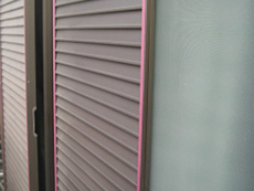 | クラック補修4)これで、外壁塗装のための下地が整いました。 | 雨戸錆止め1)雨戸に塗装を施します。ペンキがついてほしくない部分にマスキングをしました | 雨戸錆止め2)錆び止めがペンキがきれいに塗れるよう、錆びや汚れを落とします。「ケレン」と呼ばれる工程です |