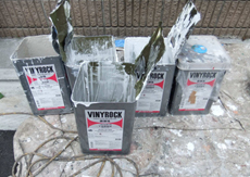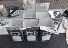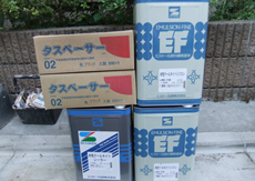 | 外壁に使用した下地材です。 | 上塗り用の塗料もしっかりと5缶使いました。 |