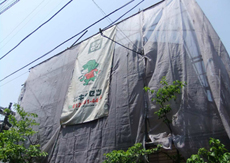 | 工事の前に、家全体に足場を掛け、シートをかけます。塗料が外部に飛ばないようにする意味もありますが、万が一、道具が落下した場合に危険防止の意味合いも大きいです。 | 塗装部分はしっかりと養生しました。庭木なども、安全な場所に職人たちが移動します。 | 塗料がつかないよう、しっかりと養生をします。 |