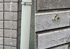 | 塗膜が取れて水を含み膨らみ表面が剥がれています。色褪せも見受けられます。 | 目地がヒビ割れした為、撤去したシール材です。 | いよいよ塗装。住宅密集地では近隣への配慮の為、ローラーで塗っていきます。(1)下地処理シーラー(塗料の密着性を高める接着剤)を塗る→下塗り塗装(1回目) |