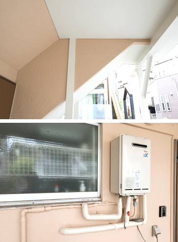 | 屋根は瓦から金属製の屋根にリフォームし、外壁の塗装と雨どいの交換を一緒に行いました。家の"鎧"の部分を整え、この先も安心して生活できるようにリフォームしました。家の外壁はベージュに、駐車場の部分は白く塗り、アクセントを付けると同時に、明るい印象に仕上げました。 | 駐車スペースの鉄骨部分や、天井はホワイトで塗装しアクセントをつけて明るい雰囲気に仕上げました。給湯器の周りの細かな部分もきれいにしました。 |