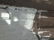 診断のため屋根に上ってみると塗膜は剥がれてしまっており、藻やコケが発生していました。また、外壁もクラック(ひび割れ)や塗膜の劣化が起こっており、全体的な塗替えをご提案させていただきました。 |